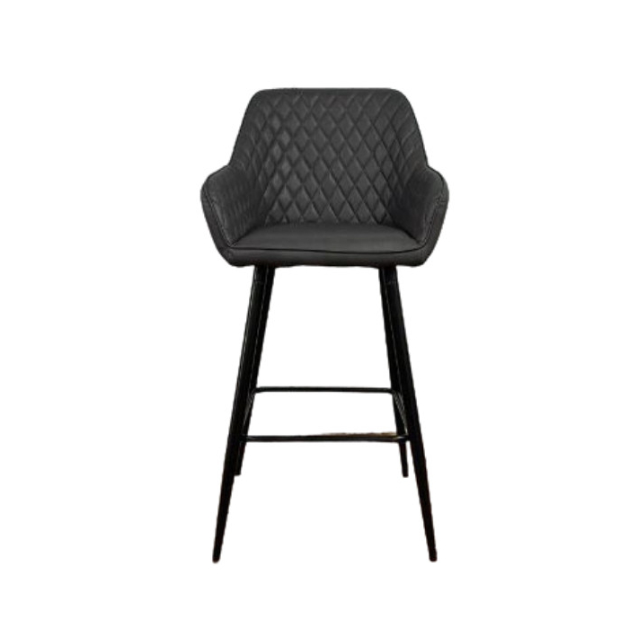 Hele mooie barkruk gemaakt van antraciet grijs p.u. leder. Op de rugleuning zitten mooie decoratieve stiknaden. Het onderstel is gemaakt van zwart metaal.