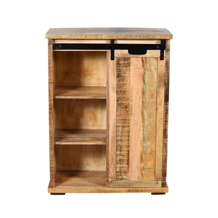 Ladekast gemaakt van mangohout gecombineerd met zwart staal. De kast is voorzien van een schuifdeur, vier open vakken en drie laden. Achter de schuifdeur bevinden zich drie opbergvakken.