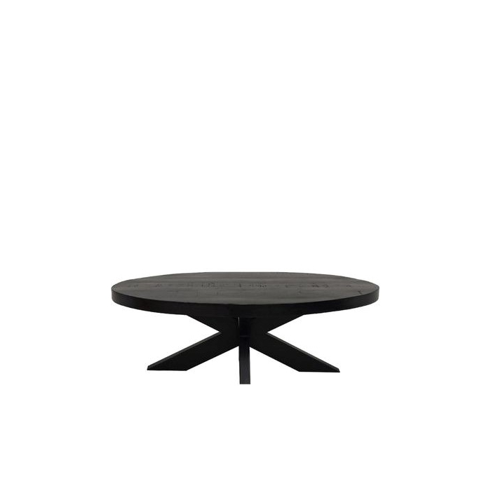 Mooie salontafel ovaal gemaakt van mangohout met een spinpoot van zwart staal.