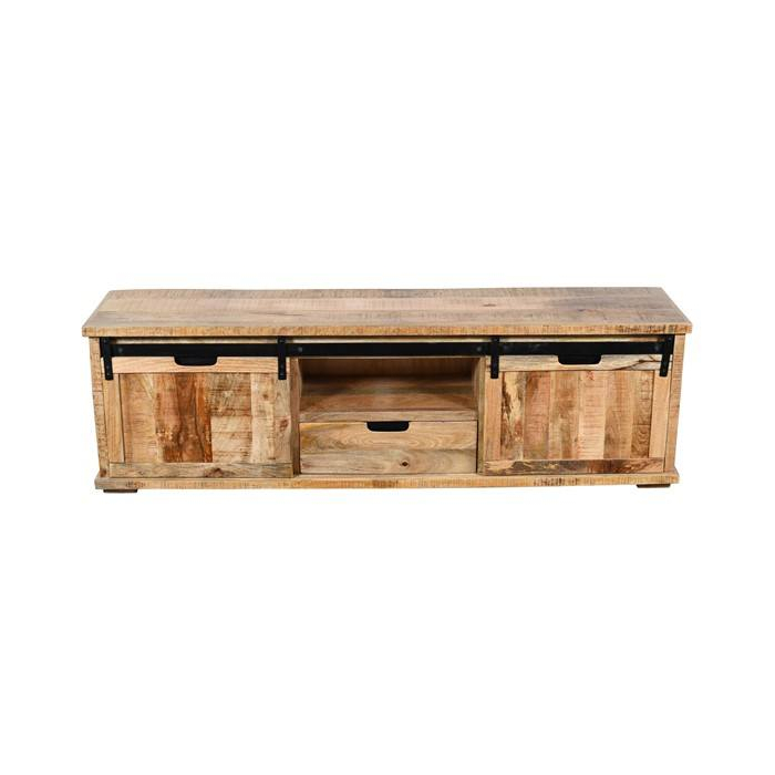 Dit mangohouten tv dressoir heeft 1 lade en 2 schuifdeuren. De totale afmeting is: 180 x 40 x 55h.