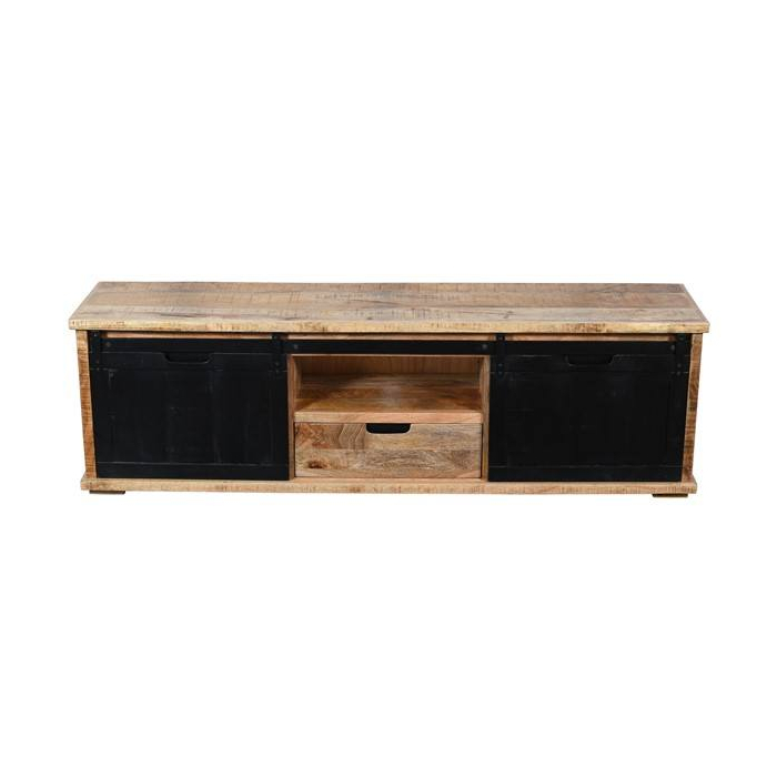 Deze mangohouten tv kast heeft 1 lade en 2 zwarte schuifdeuren. De afmeting is: 180 x 40 x 55h.